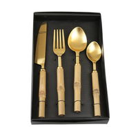 Goldenes Besteck – ein Highlight bei jedem Fest. Das Besteck hat einen Bambus-Griff, der Messer, Gabel und Co. das gewisse Etwas verleiht. Das Besteck überzeugt mit einer Kombination aus elegantem Gold und modernen Bambus-Look.