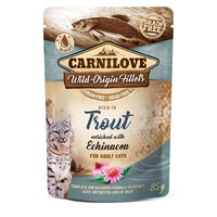 Carnilove Katze Pouch – Trout with Echinacea mit viel Wildfleisch-Anteil sind besonders lecker und schmecken Katzen als vollwertiges Alleinfutter oder auch in Kombination mit Carnilove Trockenfutter. Carnilove wurde mit dem Gedanken an die ursprüngliche Herkunft von Hunden und Katzen entwickelt. Ein breites Spektrum an sorgfältig ausgewählten Sorten gewährleisten die Versorgung mit wichtigen Aminosäuren. Waldfrüchte, Gemüse, Wildbeeren und Kräuter sind natürliche Vitamin- und Nährstoffquellen und reich an Antioxidantien.