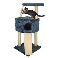 Der blaue Cat Dream Eckboy misst etwa 112 cm in der Höhe und ist mit einer großen Bodenplatte, einer fünfeckigen, geräumigen Wohnhöhle sowie einer Beobachtungsplattform, die zugleich den Abschluss des Kratzbaums markiert, ausgestattet. In der mit kuscheligem Plüsch bezogenen Wohnhöhle findet Ihr Samtpfötchen einen bequemen Rückzugsort zum Schlafen, während es von der Beobachtungsplattform aus freien Blick auf die Geschehnisse im Umfeld hat. Auch die Bodenplatte ist mit blauem, herrlich weichem Plüsch bezogen.