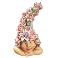 Der kleine Wichtel mit Blumenmütze begeistert als eine charmante, wetterfeste Deko aus Kunstharz.