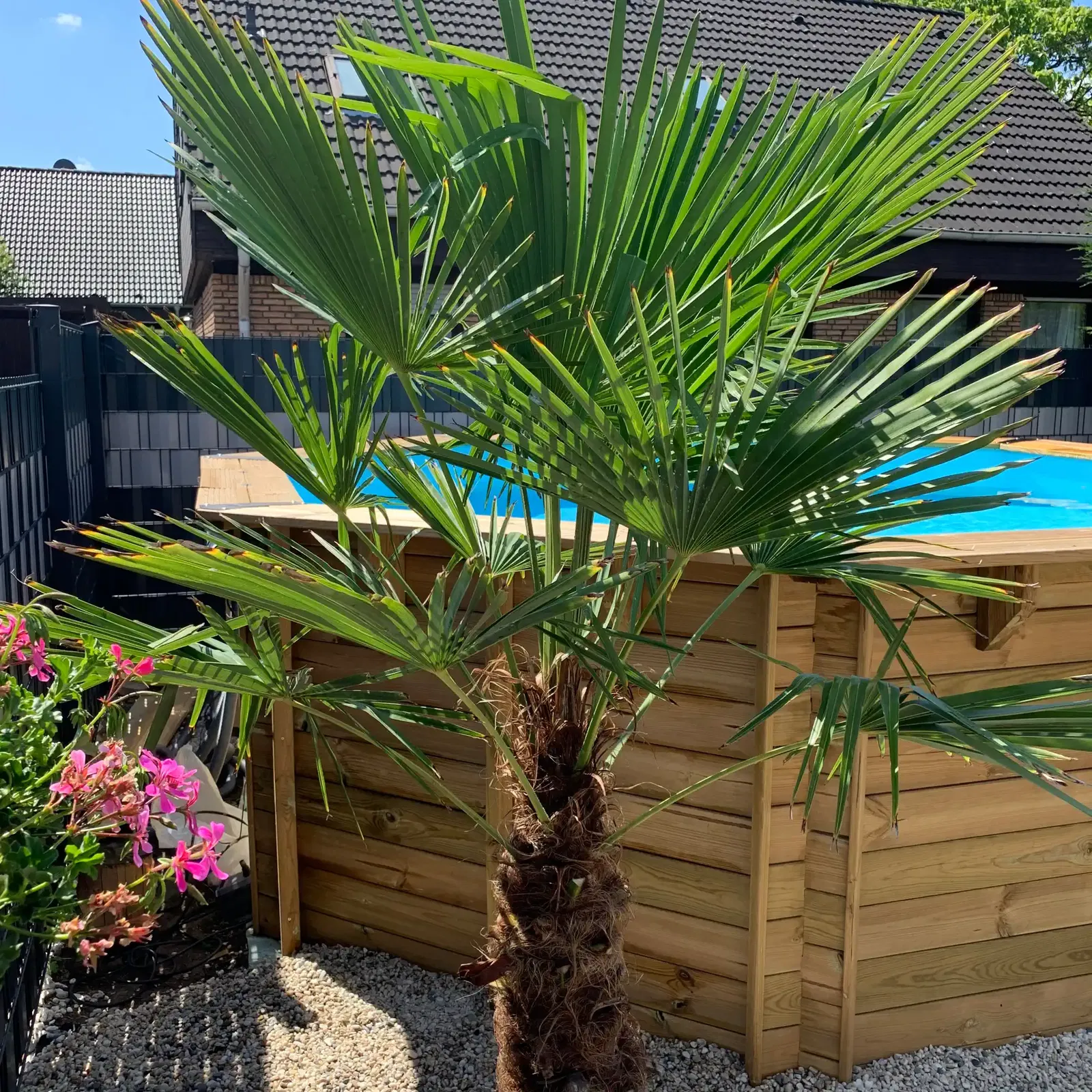 Wenn Sie Ihre Palme online kaufen und die Palme im Topf halten möchten, ist es zudem wichtig, dass es nie zu Staunässe kommt. Überschüssiges Wasser kann durch Abzugslöcher abfließen und sollte 15min nach dem Gießen weggeschüttet werden. So verhindern Sie Wurzelfäule an Ihren Palmen. Hilfreich ist dafür auch die Verwendung einer Drainageschicht aus Blähton.