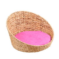 Naturfarbener Katzenkorb aus Wasserhyazinthe mit pinkfarbenem Kuschelkissen. Weich und anschmiegsam, ideal für den erholsamen Katzenschlaf.