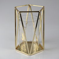 Das goldfarbene Windlicht aus Eisen und Glas lässt ein romantisches Ambiente entstehen.